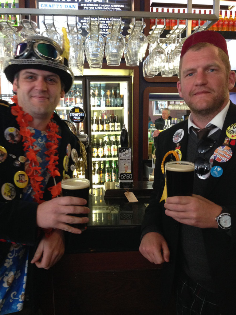 Johnny Disco Loony party candidate for Wythenshawe & Sale East in Manchester. And Lord Cameron of Roundwood Loony party candidate for Northenden in the Manchester local elections. Having a pint of the delicious Howlin’ Gale by Wild Weather breweries in the Paramount Wetherspoons on Oxford Rd in Manchester’s city centre. If elected Johnny Disco has some big plans for Wythenshawe. He has promised to kick start the Wythenshawe Space Program by using Wythenshawe Airport (sometimes referred to as Manchester Airport) and has promised free travel on all buses and trams for musicians. In his spare time Johnny likes to follow the fortunes of Manchester City and Lord Cam supports Manchester United.
