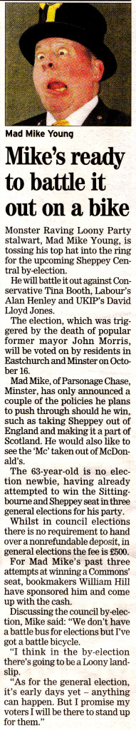 Monster Raving Loony Party stalwart, Mad Mike Young, is tossing his top hat into the ring for the upcoming Sheppey Central by-election. He will battle it out against Conservative Tina Booth, Labour’s Alan Henley and UKIP’s David Lloyd Jones. The election, which was triggered by the death of popular former mayor John Morris, will be… Read More